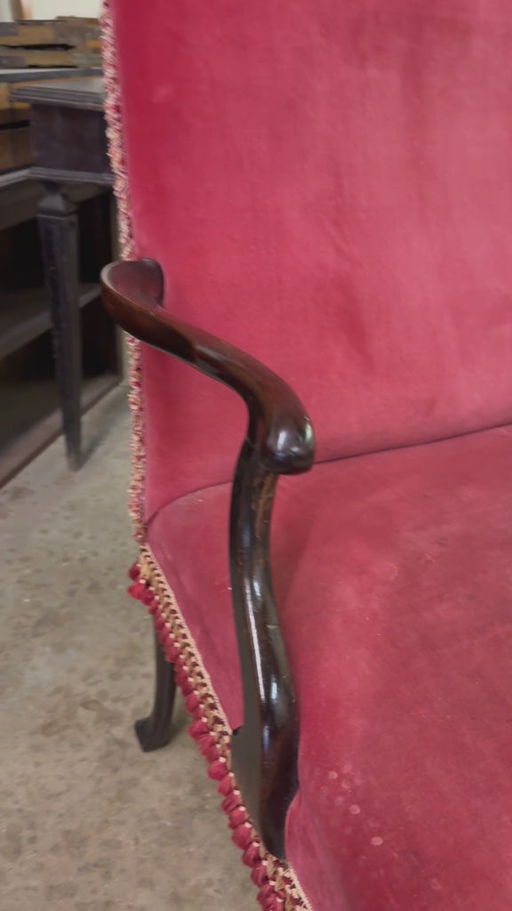 having a shaped backrest with notched corners with serpentine shaped arms atop curved armrests, the generous seat resting on cabriole legs ending in stylized pad feet, upholstered in a faded red velvet trimmed with fringe